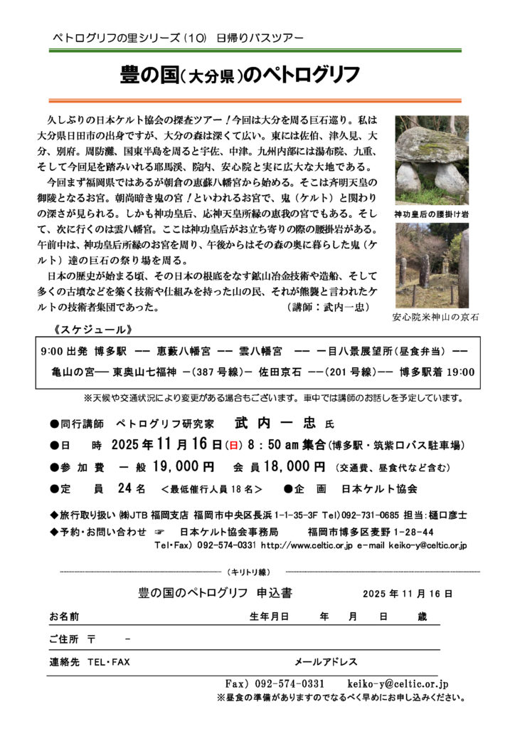 ペトログリフは、先史時代に古代の人々が残した「石に刻まれた文字」(岩刻文字)を意味します。ペトログリフ研究家・武内一忠氏とご一緒に斉明天皇の御陵とされる朝倉郡の「恵蘇八幡宮」を皮切りに「雲八幡宮」、「亀山の宮」などを経由して、安心院の「佐田京石」へと向かいます。この機会に「豊の國」のペトログリフに触れていただければ存じます。また時節柄 紅葉も楽しんでいただけることでしょう。
